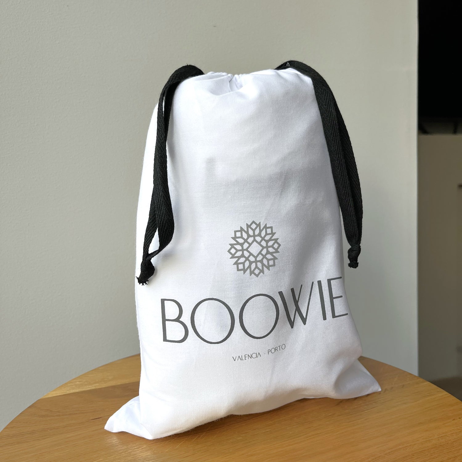 Cuidamos cada detalle para que recibas tus productos BOOWIE con la mejor presentación. Nuestro saquito de tela blanco será perfecto para reutilizar en viajes o para el armario