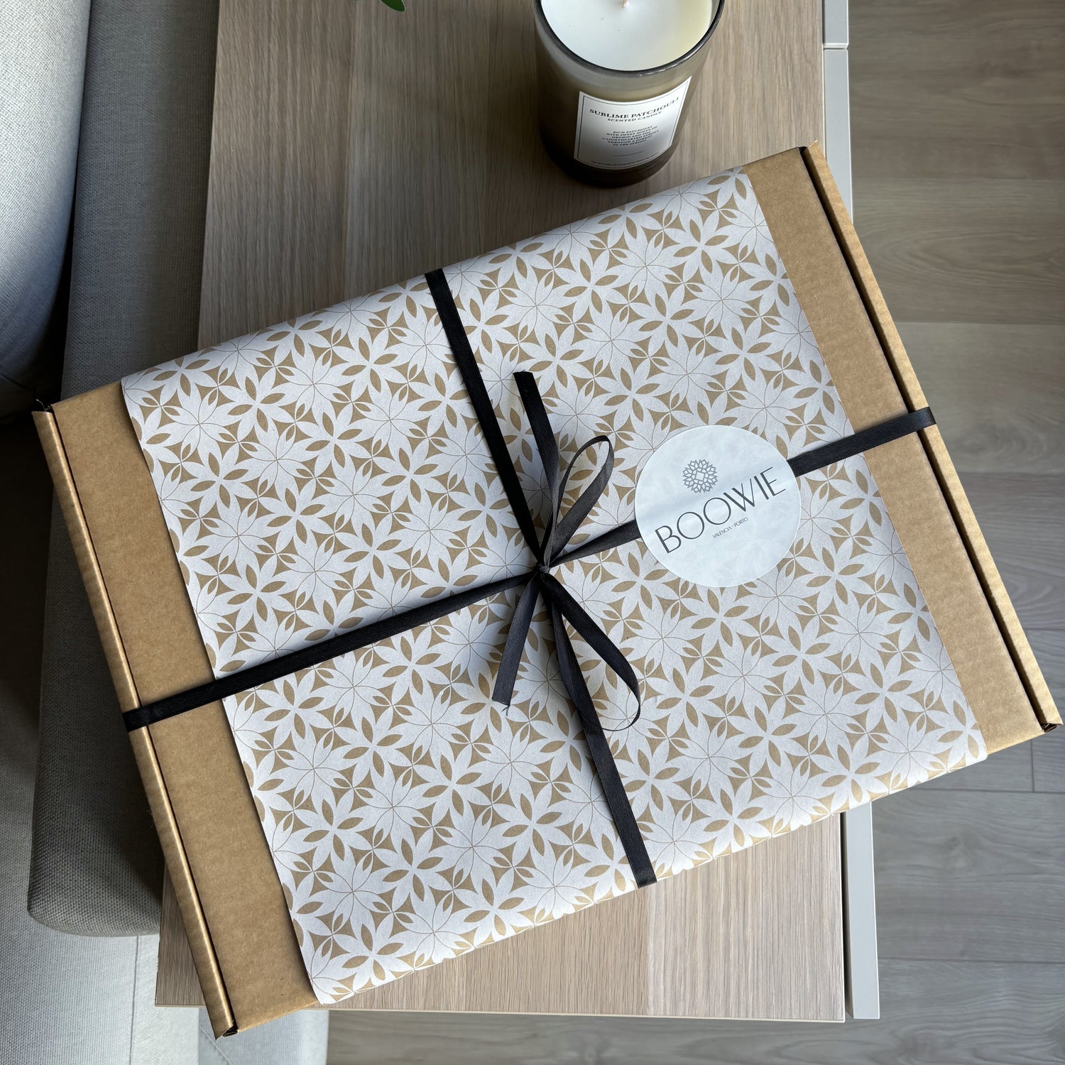 Cuidamos cada detalle para que recibas tus productos BOOWIE con la mejor presentación. Caja con cinta regalo de raso negro y en el interior, tus artículos envueltos en papel de seda blanco